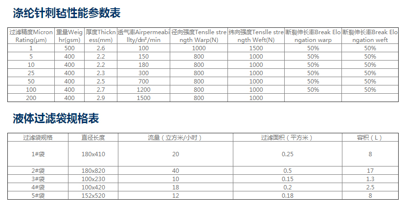 滌綸(PE) 滌綸在常溫下有很好的使用性能,是袋濾器中的主力濾料。可在干燥條件下經受130℃的操作溫度;連續在130℃以上工作會變硬;退色;發脆,溫度也會使其強度變弱。滌綸化學穩定性好,能耐大多數酸堿的侵蝕。常溫下不溶于一般溶劑,吸水性小,此外電絕緣性和抗沖擊性及耐寒性能很好。過濾精度范圍在1-200um 。